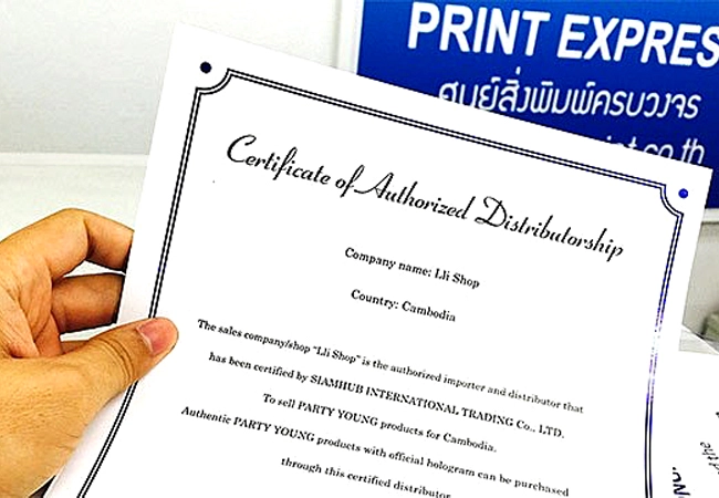 ร้านเราไม่รับ ปลอมแปลงใบประกาศ ทำซ้ำ หรือดัดแปลง จากต้นฉบับนะครับ เราผลิตขั้นต่ำ 20 ใบขึ้นไป และ ต้องเป็นเจ้าของ หรือองค์กร Official เท่านั้น ในการสั่งพิมพ์ใบประกาศได้ ต้องขออภัยในความไม่สะดวกด้วยนะครับ